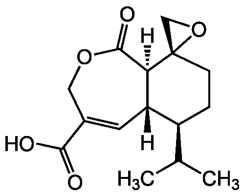 Koningic acid (CAS No. 57710-57-3) (Figure 1) is a sesquiterpene lactone (molecular mass of 280.3) produced by the fungus Trichoderma koningii (1). Koningic acid inhibits glyceraldehyde 3-phosphate dehydrogenase (GAPDH) from various species by binding to the essential Cys residue in the catalytic site through a thioether bond (2-4). The covalent modification of the essential Cys by koningic acid leads to irreversible inactivation of GAPDH (2,3). The affinity of koningic binding to GAPDH for the inactivation is 1.6 μM (2).