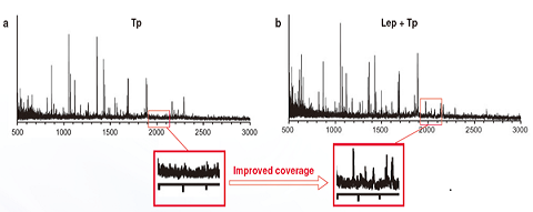 Lep+Tp酶切后,可以在m/z=2000时得到吸收峰,而单独的Tp酶切在m/z=2000时没有吸收峰。该结果表明Lep可以提高测序覆盖度。